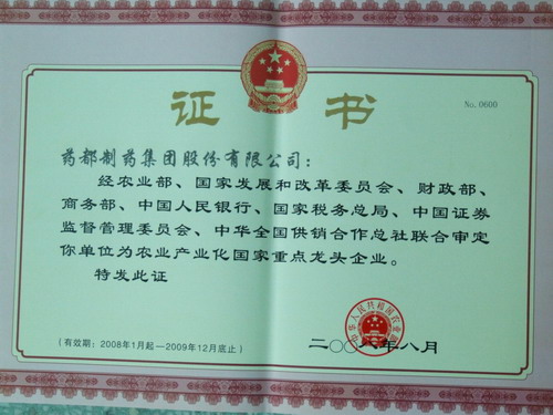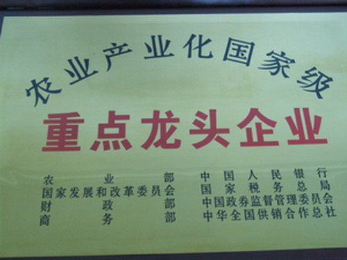 經(jīng)農(nóng)業(yè)部、國(guó)家發(fā)改委、財(cái)政部、商務(wù)部、中國(guó)人民銀行、國(guó)家稅務(wù)總局、中國(guó)證券監(jiān)督管理委員會(huì)、中華全國(guó)供銷(xiāo)合作總社聯(lián)合審定,我公司被評(píng)為農(nóng)業(yè)產(chǎn)業(yè)化國(guó)家重點(diǎn)龍頭企業(yè)。