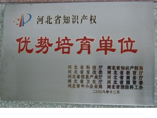 2008年12月,我公司被河北省科技廳、河北省知識(shí)產(chǎn)權(quán)局、河北省發(fā)改委、河北省教育廳、河北省信息產(chǎn)業(yè)廳、河北省商務(wù)廳、河北省衛(wèi)生廳、河北省國(guó)資委、河北省中小企業(yè)局、河北省國(guó)防科工辦評(píng)為“河北省知識(shí)產(chǎn)權(quán)優(yōu)勢(shì)培育單位”。