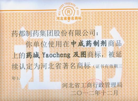 2012年12月,經(jīng)河北省工商行政管理局審評,我公司“普濟堂”商標、“藥城”商標被延續(xù)認定為河北省著名商標。
